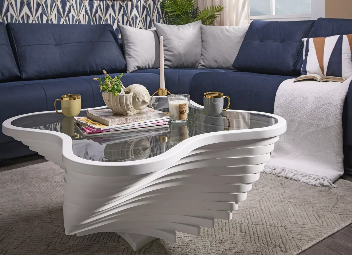 Baršunasti materijal garniture sjajno će se uklopiti uz staklenu površinu klub stočića, a primeri poput poput klub stola LARA ili FREZIJA sa belom konstrukcijom prostor će dodatno osvežiti i uneti moderan duh.
