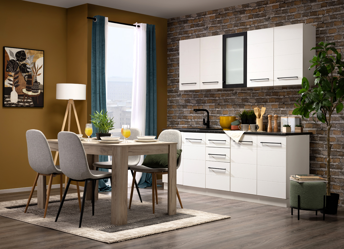 Kuhinja RAJNA 200 predstavlja pažljivo osmišljeno rešenje za moderno opremanje kuhinjskog prostora, u kojem se praktičnost i estetika prirodno dopunjuju. Savremeni dizajn, naglašen kombinacijom belog dekora visokog sjaja i elegantne crne mat folije, stvara vizuelno uravnotežen ambijent koji se lako uklapa u različite stilove savremenog enterijera, donoseći prostoru dozu sofisticiranosti i bezvremenske elegancije.