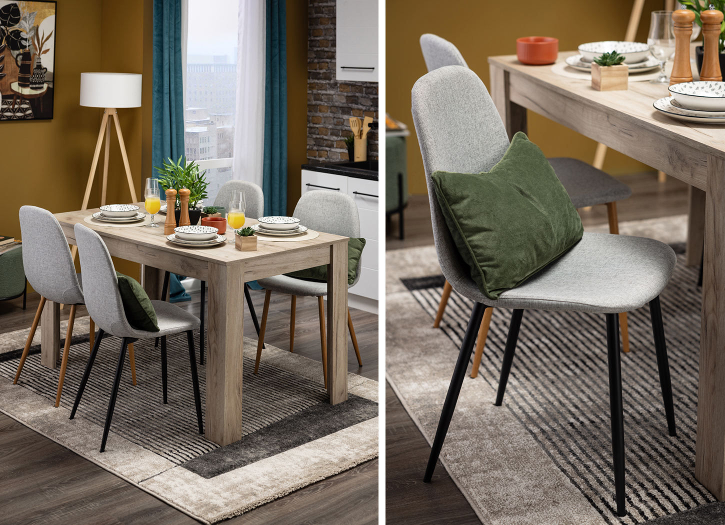 Trpezarijski sto ITAKA, u dezenu sivog hrasta, predstavlja odličan izbor za savremeno uređenu trpezariju, zahvaljujući modernom dizajnu i bezvremenskom izgledu koji se lako uklapa u različite stilove enterijera. Neutralna boja i jednostavne linije čine ga izuzetno prilagodljivim, omogućavajući lako kombinovanje sa trpezarijskim stolicama različitih oblika, materijala i dezena, uz potpunu slobodu u kreiranju ličnog trpezarijskog ambijenta. U tom kontekstu, trpezarijska stolica CELIA, sa crnom metalnom konstrukcijom i tapaciranim naslonom i sedištem u svetlo sivoj nijansi štofa, unosi dozu elegancije i savremenog karaktera. Trpezarijska stolica CELIA savršeno spaja funkcionalnost i komfor i veoma lako se uklapa u moderne životne prostore i različite enterijerske stilove.