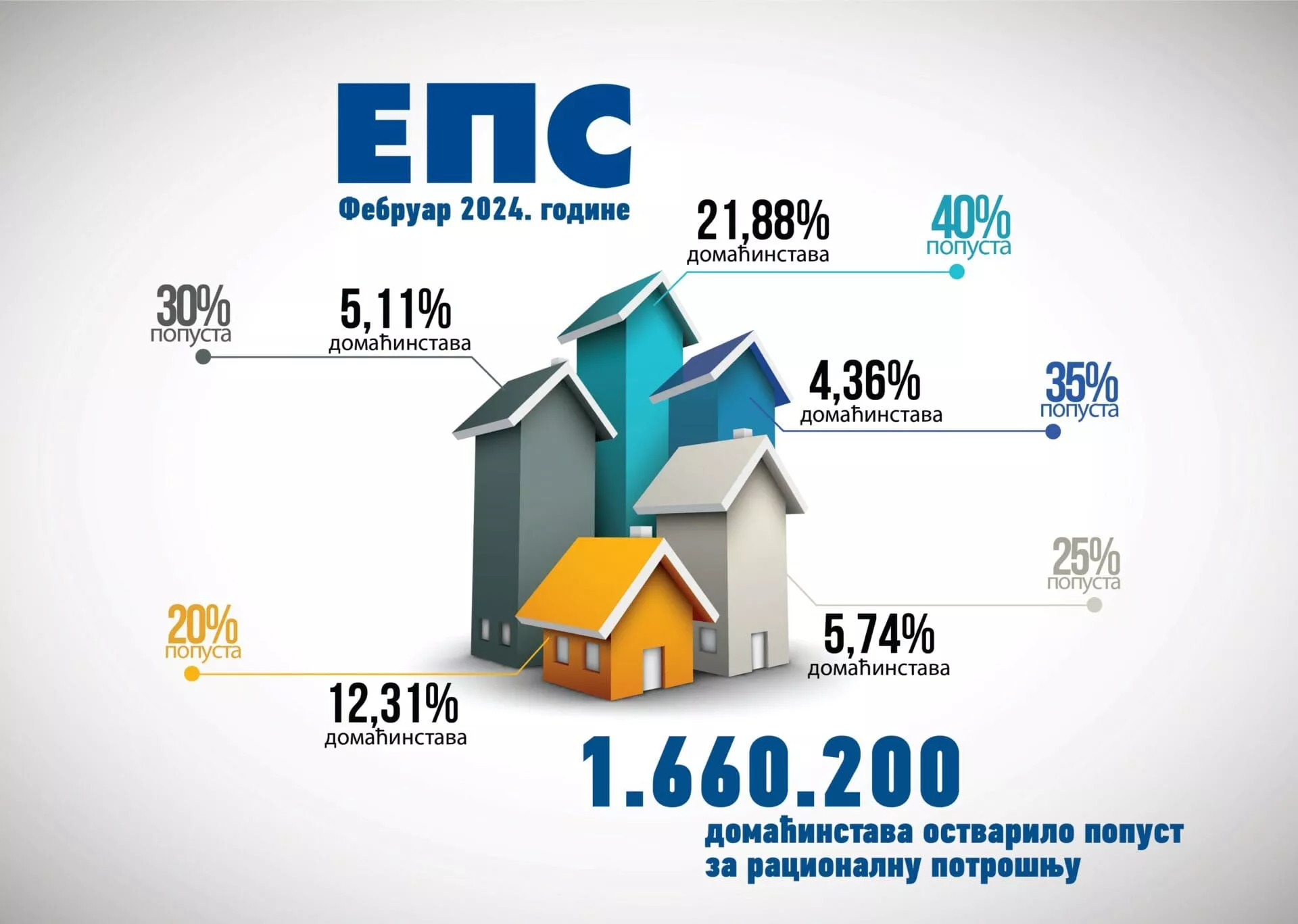 Najveći popust od 40 odsto na računima za električnu energiju ostvarilo je 22 odsto domaćinstava. Popust od 20 odsto dobilo je 12 odsto domaćinstava. Umanjenje računa od 25 odsto ostvarilo je skoro 6 odsto domaćinstava, dok je za isti broj domaćinstava obračunat popust od 30 odsto.