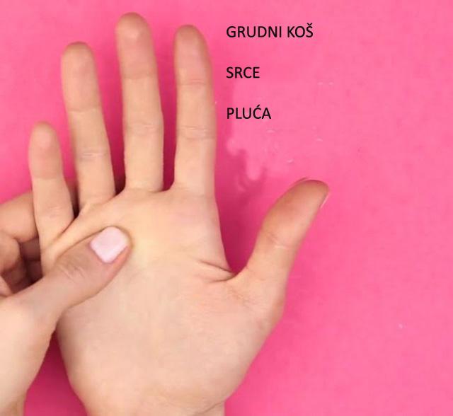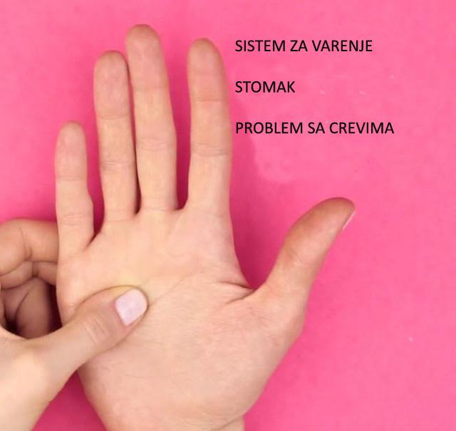 Trebalo bi da masirate određene tačke na dlanovima sporim, kružnim pokretima palca. Vaša desna strana dlana odgovara desnoj strani vašeg tela, a leva strana dlana levoj. Ukoliko to pravilno činite, masiranje ovih zona će brzo rešiti probleme određenih organa.
