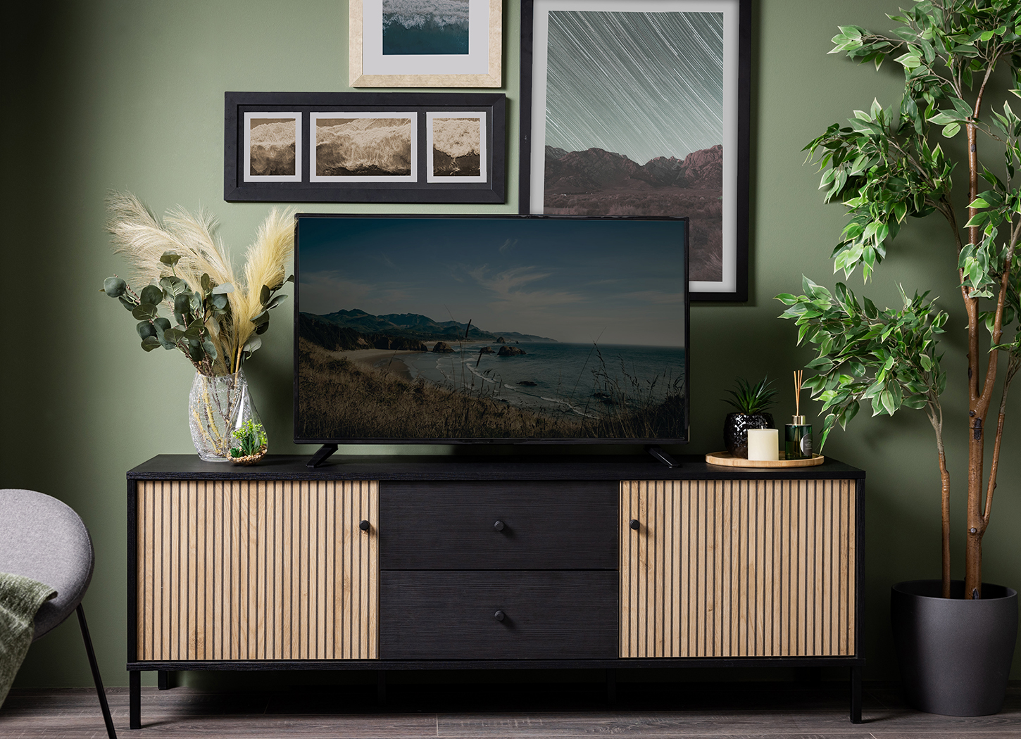 Funkcionalno organizovan prostor oko TV-a doprinosi boljoj estetici i izgledu dnevne sobe. TV police omogućavaju da sve bude na svom mestu, uz dovoljno prostora za dekorativne elemente koji oplemenjuju ambijent, a kombinacijom detalja na samoj polici i zidnim dekoracijama iznad, prostor dobija dodatnu dimenziju. Na taj način dnevni boravak ostaje uredan, praktičan i prijatan za boravak.