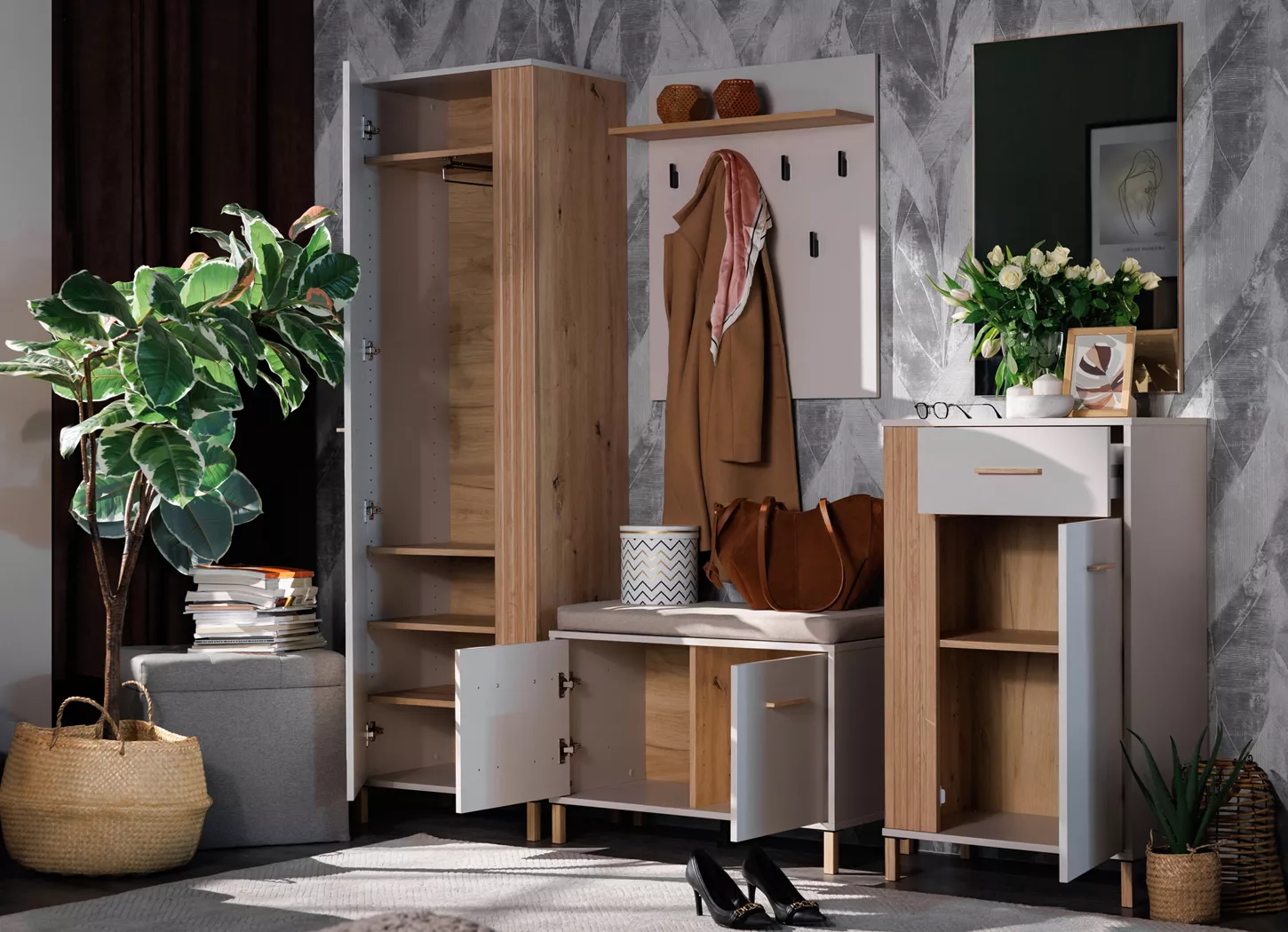Dizajn ove kolekcije počiva na minimalizmu sa karakterom – spoj svetlih, neutralnih tonova i toplih drvenih nijansi stvara prijatan, „vazdušast“ utisak, što je posebno važno za predsoblja koja su često uska i bez prirodnog svetla. Poseban vizuelni pečat daju vertikalne letvice na frontovima, koje unose teksturu i prostoru daju moderan, gotovo arhitektonski ritam.