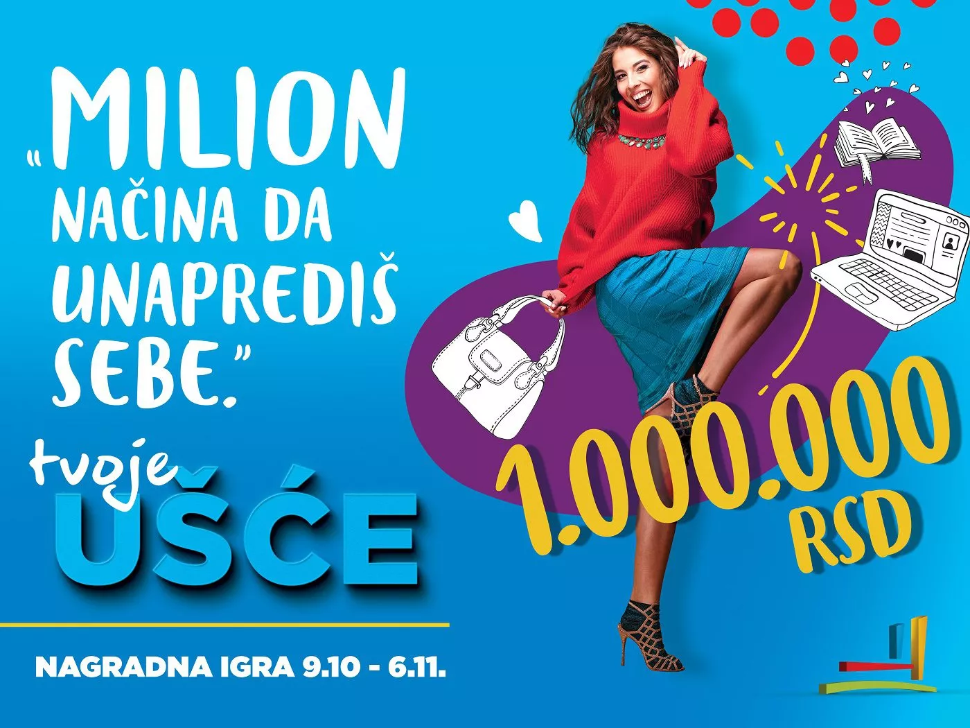 Svako ko u periodu od 9. oktobra do 6. novembra obavi kupovinu u tržnom centru UŠĆE , u iznosu preko 3.000 dinara, sa najviše dva računa koja se mogu sabirati, imaće priliku da osvoji šoping vaučer u vrednosti od 3.000, 12.000 ili milion dinara za kupovinu u UŠĆU.