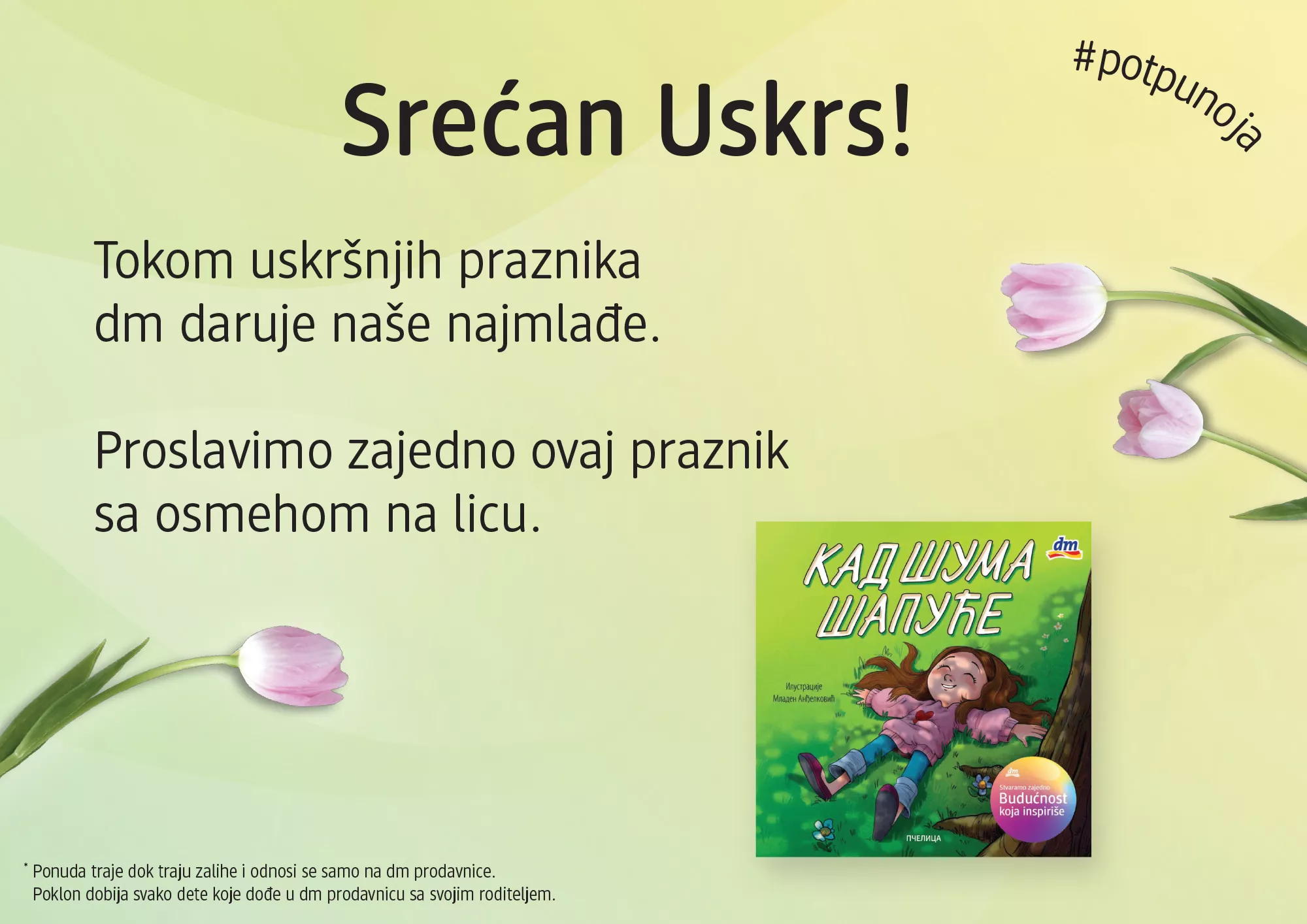 Svako dete do 10 godina koje u pratnji roditelja poseti neku od dm prodavnica biće obradovano posebnim poklonom. Reč je o slikovnici „Kad šuma šapuće“, pažljivo osmišljenoj knjizi koja nije samo poklon, već je i nežan uvod u važne vrednosti koje će oblikovati buduće generacije.
