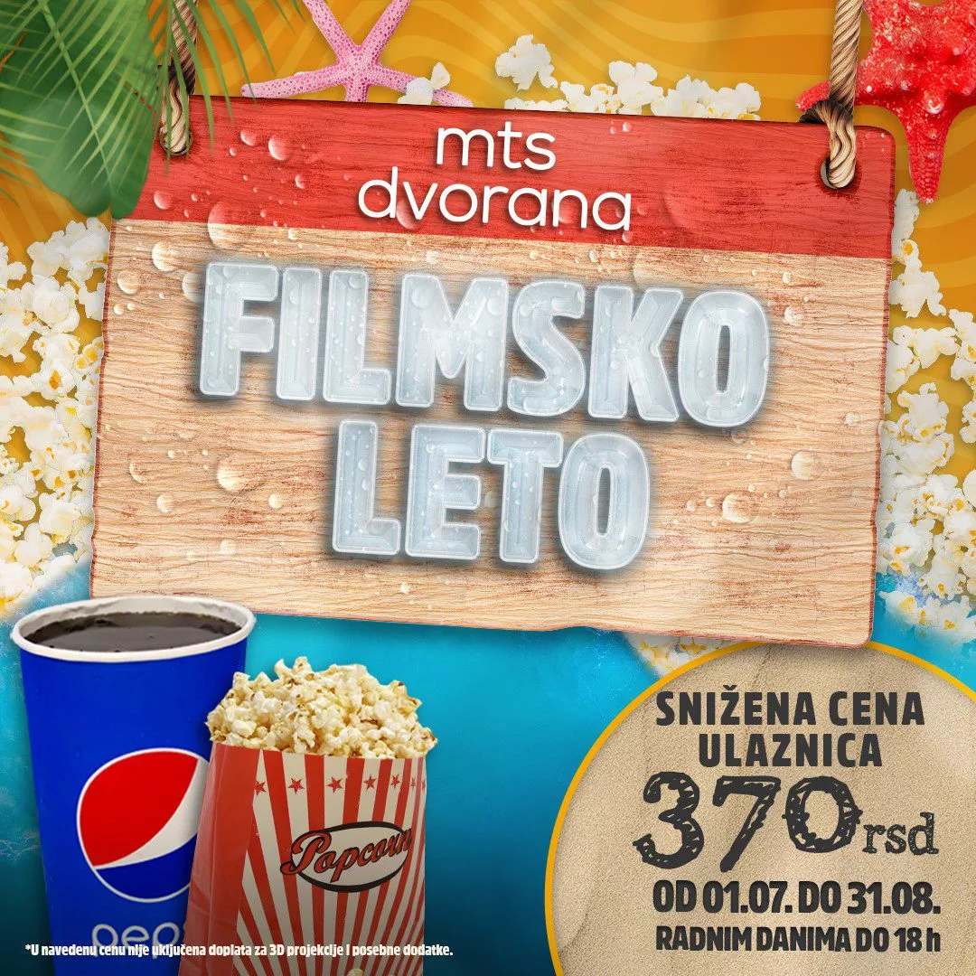Naime, u okviru velike filmske akcije „FILMSKO LETO“ U BIOSKOPIMA MTS DVORANA, CINE GRAND BIG RAKOVICA, VILIN GRAD I CINE GRAND DELTA PLANET U NIŠU koja počinje 1. jula i traje do 31. avgusta, posetioci bioskopa moći će sve filmove sa repertoara da pogledaju po specijalnoj promotivnoj ceni od 370 dinara, svakog radnog dana do 18h.