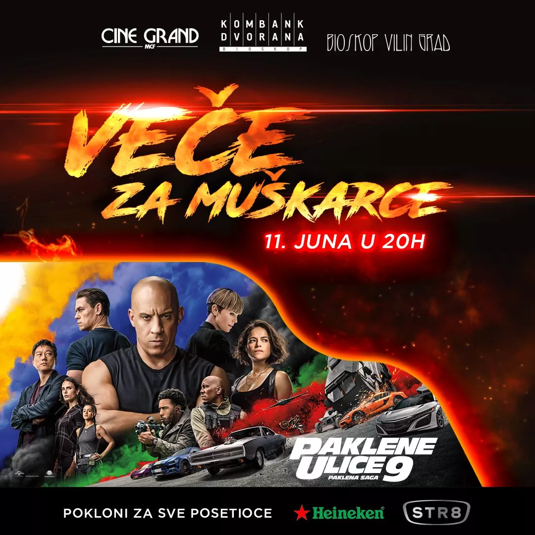 Nakon dve godine od poslednjeg dela, vraća se na velika vrata film Paklene ulice 9 (FAST AND FURIOUS ) reditelja Džastina Lina. Ovaj uzbudljiv akcioni triler naći će se na bioskopskom repertoaru Kombank Dvorane od petka 11. juna u 20h u okviru „Večeri za muškarce“. Svi posetioci na poklon će dobiti Dezodorans STR8 i Haineken pivo.