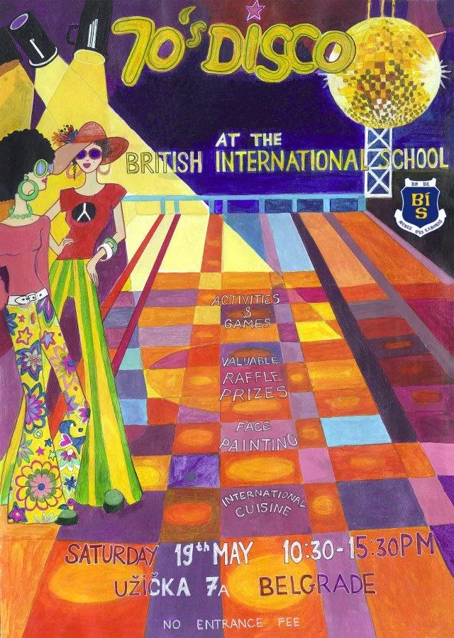 U predivnom dvorištu i zgradi osnovne škole koja se nalazi na adresi Užička 7a u Beogradu, BRITISH INTERNATIONAL SCHOOL organizuje u subotu, 19. maja 2018. od 10:30 do 15:30 časova, izuzetno zanimljiv i posećen humanitarni bazar pod nazivom „SEVENTIES DISCO“.