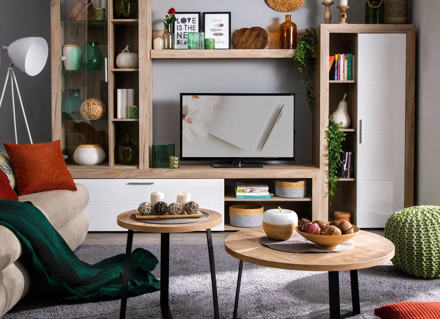 U ovakav enterijer dnevnog boravka sjajno se uklapa i regal MERIDA koji zbog lajsni koje doprinose osećaju masivnosti korpusa, kao i otvorenim policama, ali i onim zastakljenim, ističe vanvremenske stilske karakteristike koje su lako uklopive i uz druge stilove.