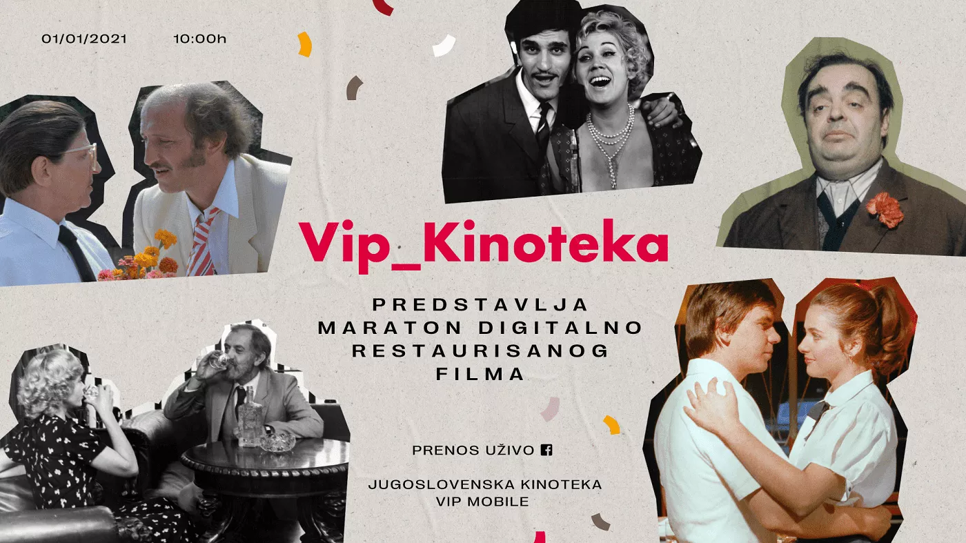U želji da ulepša prvi dan Nove godine i obraduje građane širom Srbije nešto drugačijim novogodišnjim programom, Vip mobile i Jugoslovenska kinoteka organizovaće prvi onlajn maraton digitalno restauriranog filma. Deset kultnih ostvarenja reditelja Gorana Markovića, Božidara Nikolića, Slobodana Šijana, Srđana Karanovića, Gorana Paskaljevića, Živka Nikolića i Živojina Žike Pavlovića, u produkciji Centar filma, biće emitovana kroz prenos uživo 1. januara 2021. od 10.00 ujutru sve do dva časa iza ponoći na Facebook stranicama kompanije Vip mobile i Jugoslovenske kinoteke.