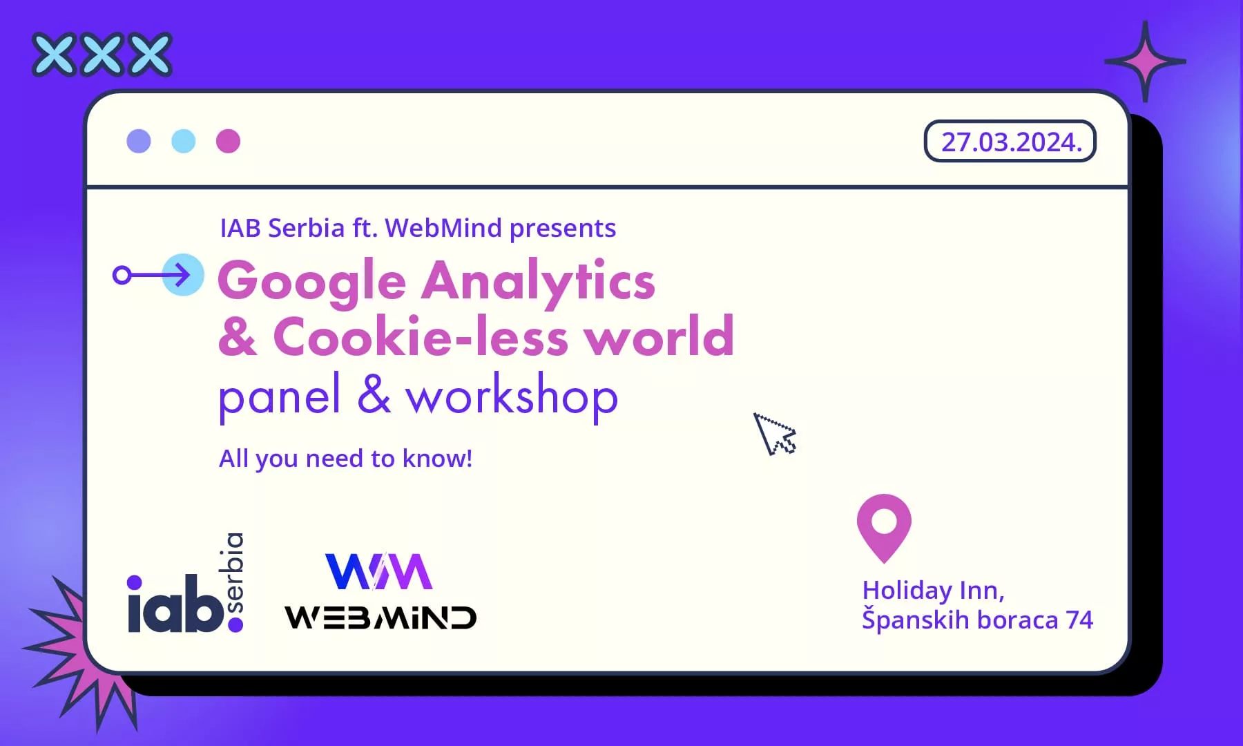 WebMind, u saradnji sa IAB Serbia najavljuje predstojeći workshop i panel diskusiju na temu „Google Analytics & Cookiesless era“. Događaj će se održati 27. marta 2024. godine, u prostorijama hotela Holiday Inn (Španskih boraca 74, Novi Beograd), u periodu od 10 do 14 časova.