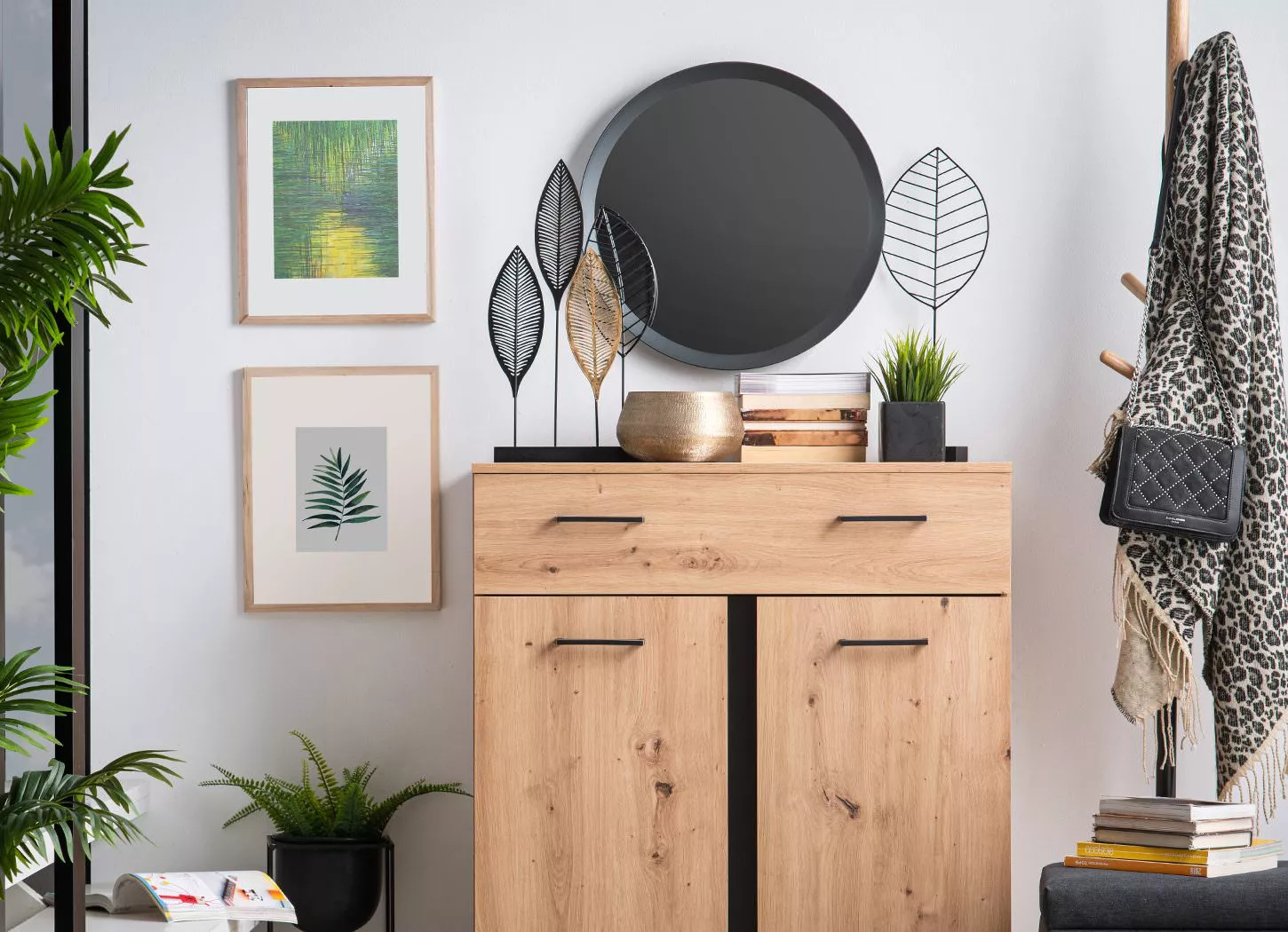 Ukoliko se odlučite za bele zidove, ambijentu možete dati pečat odabirom određenog komada nameštaja i dekoracijom koja će ići uz njega, a belu ćete najlakše utopliti drvo dekorom, poput komode SARDINIA 2K1F koja pripada industrijskom stilu. Ona je spoj topline naturalnog i rustičnog artisan hrasta sa primesama suptilnih crnih elemenata dekora, a sastoji se od dva zatvorena segmenta, sa jednom pregradnom policom i funkcionalnom fiokom.