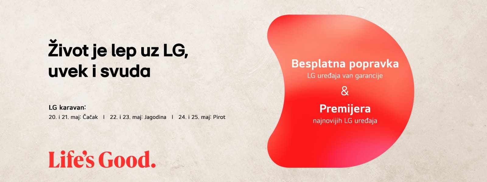Kompanija LG Electronics pokreće kampanju „ŽIVOT JE LEP UZ LG – UVEK I SVUDA“ koja će se održati sledeće nedelje u gradovima centralne i istočne Srbije. U nedelji od 21. do 26. maja, specijalan LG karavan će posetiti Čačak, Jagodinu i Pirot gde će građanima predstaviti nove proizvode i inovativne tehnologije koje olakšavaju svakodnevne aktivnosti i čine da život bude bolji i lepši!